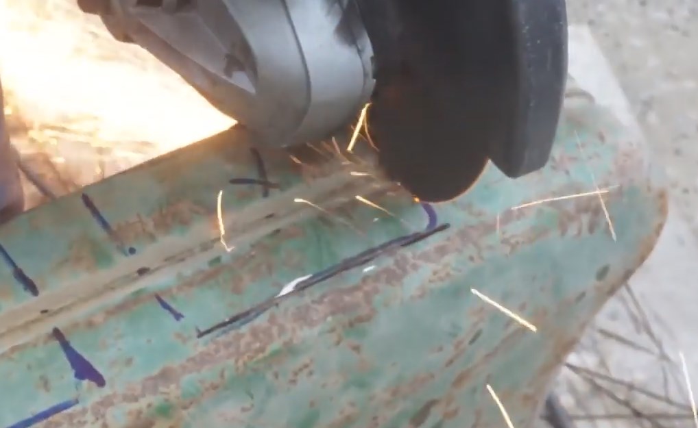 Le long du périmètre de la cartouche, j'ai marqué l'endroit de la coupe et j'ai scié la paroi latérale avec une meuleuse.