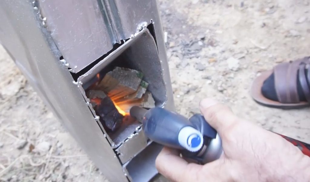 J'ai eu une préparation. Sinon, vous pouvez faire quelque chose de similaire. La chambre de combustion est située en diagonale, le tuyau inférieur sert de ventilateur et de grille, et le supérieur sert de cheminée et de source de feu pour la cuisson. Cette conception fonctionne.