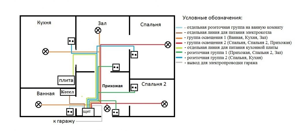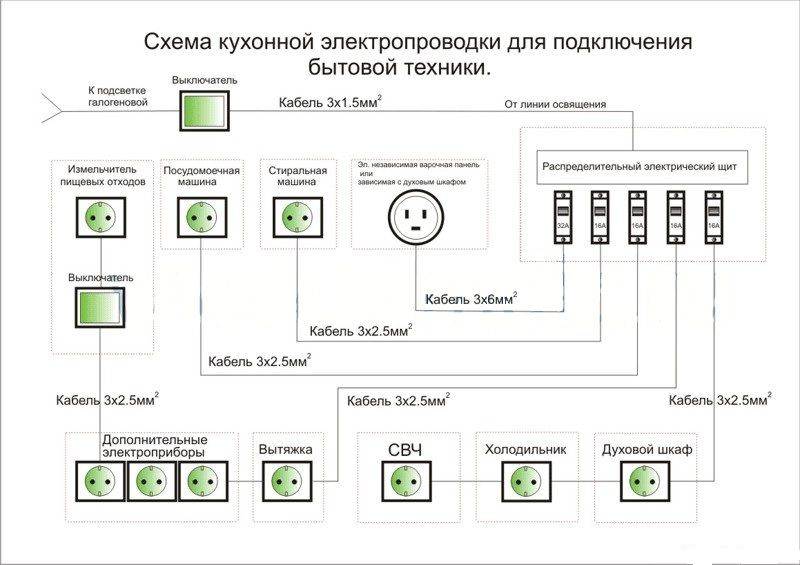 Après cela, les prises sont réparties en groupes, leur nombre sur un câble dépend de sa section transversale, mais pas plus de 3 à 5 pièces. Pour les appareils électriques puissants, il est conseillé de prévoir une ligne séparée, ainsi le fil durera plus longtemps et sera plus sûr. En conséquence, vous obtiendrez de 3 à 7 lignes dans la cuisine, de nombreux équipements sont installés ici.