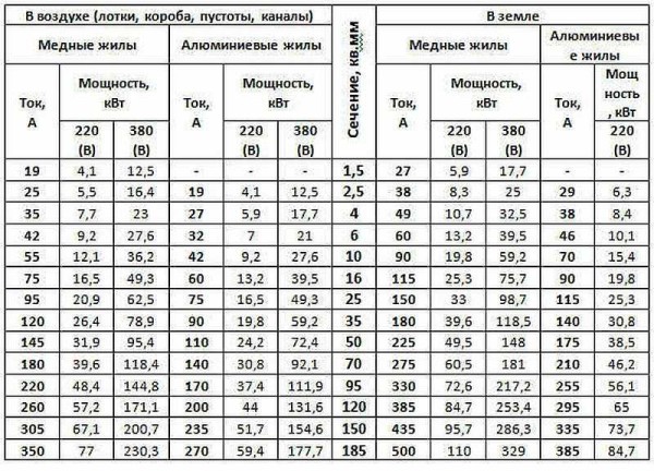 - En vous déplaçant vers la droite le long de cette ligne, jusqu'à la ligne "Section, sq. mm", trouver le diamètre requis des noyaux. A partir de câbles de ce diamètre, ils créent une ligne allant de la machine aux consommateurs d'électricité.