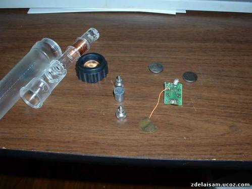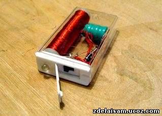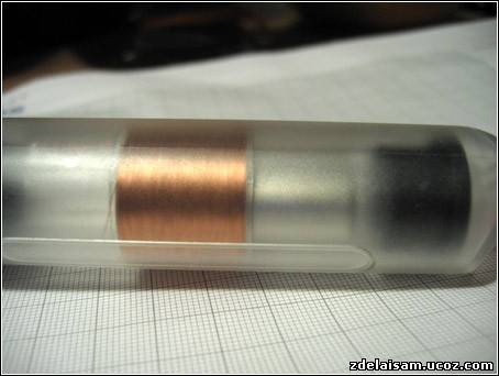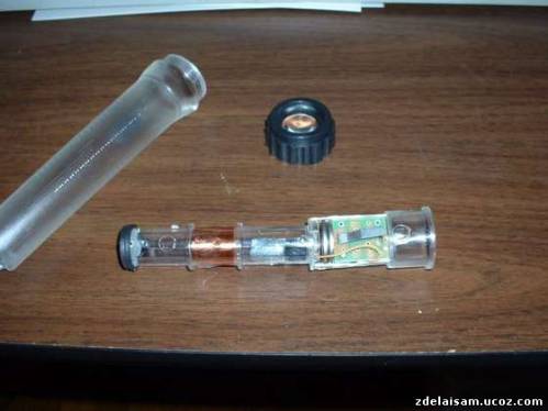 Ce prototype est réalisé dans une boite de dragées Tic-tac. La bobine est enroulée sur un tube, dans le rôle duquel le corps provient du stylo à bille le plus ordinaire. Des aimants ont été prélevés sur le disque dur. Les batteries ont été remplacées par des condensateurs. L'éclairage est assuré par une LED blanche. Photo : sdelaysam-svoimirukami.ru