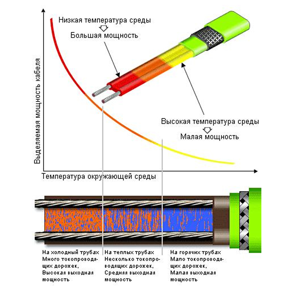 Le câble autorégulateur est installé pour chauffer les canalisations de grand diamètre, les toits et les grands locaux industriels. Le système indépendamment, sans l'utilisation de capteurs, commence à chauffer, réagissant à une diminution de la température. Dans les composants chauffants de ce type, plusieurs noyaux semi-conducteurs sont installés à l'intérieur, qui ont la capacité de changer de résistance lorsque la température augmente ou diminue. En cas de baisse de température, une diminution de la résistance se produit, ce qui augmente automatiquement la production de courant et entraîne un échauffement supplémentaire.
