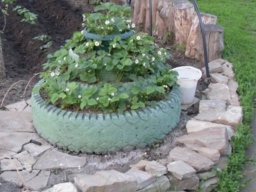 Pas une seule famille ne manque de matériel dans le pays. C'est la meilleure jardinière pour un mini jardin de fleurs. Ces objets d'art de créateurs décorent non seulement le porche, mais également l'aire de jeux, le banc, la clôture.