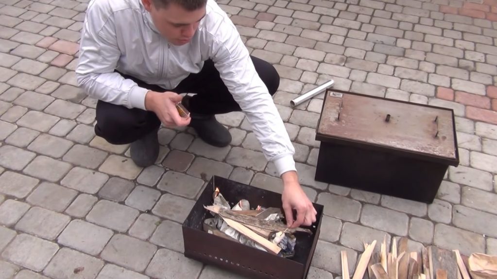 Une fois le fumoir préparé, le combustible est enflammé.