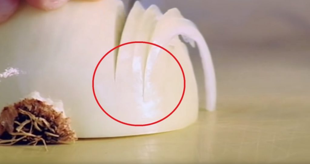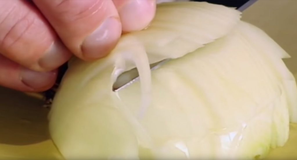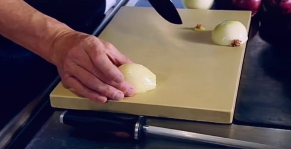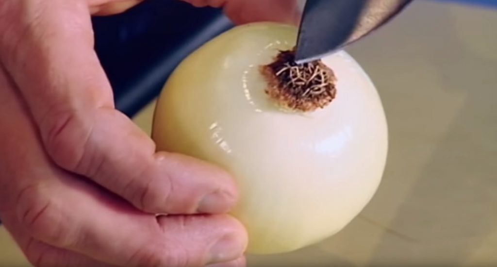 L'essence de la méthode de coupe correcte des oignons est que la zone racinaire est retirée en dernier. Dans ce cas, la quantité de sulfinylpropane libérée sera minime.