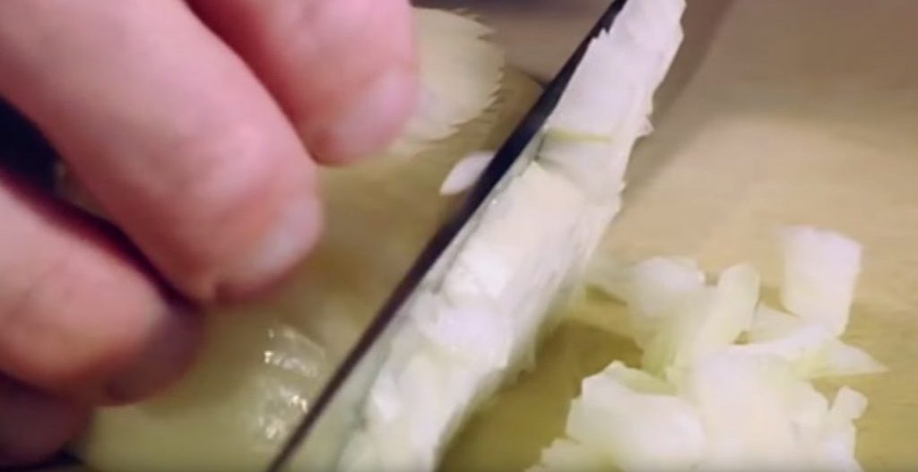 Un autre problème avec les oignons tranchés est qu'ils ont tendance à s'effondrer tout le temps. La structure multicouche de l'oignon s'effondre lorsqu'il est coupé, et si vous ne pouvez pas le tenir avec vos doigts, l'oignon finement haché sera dispersé sur une grande surface.