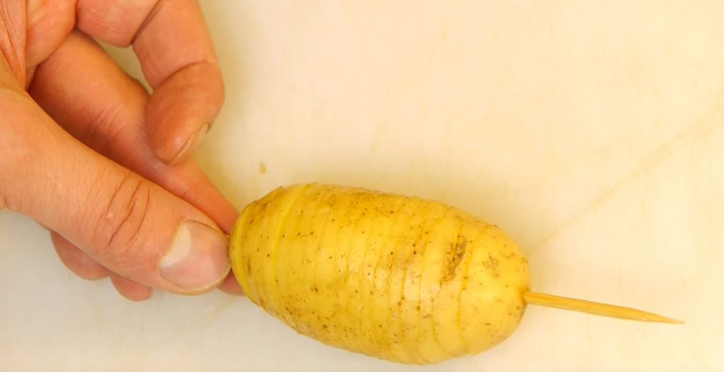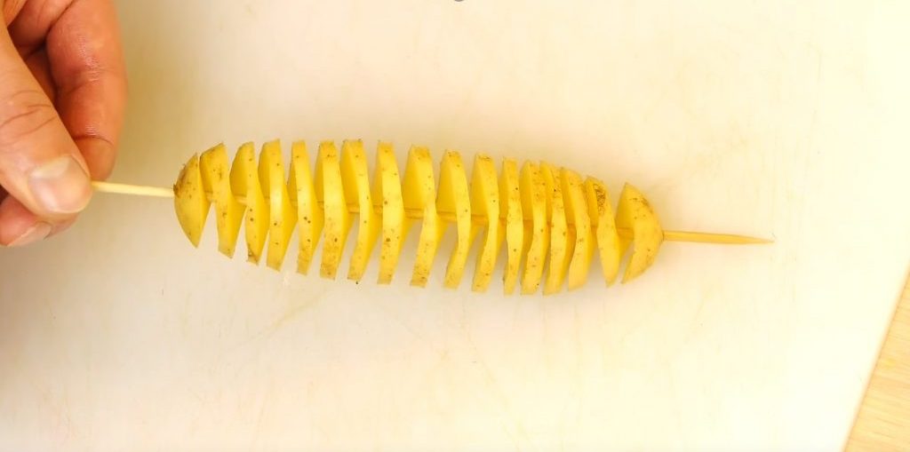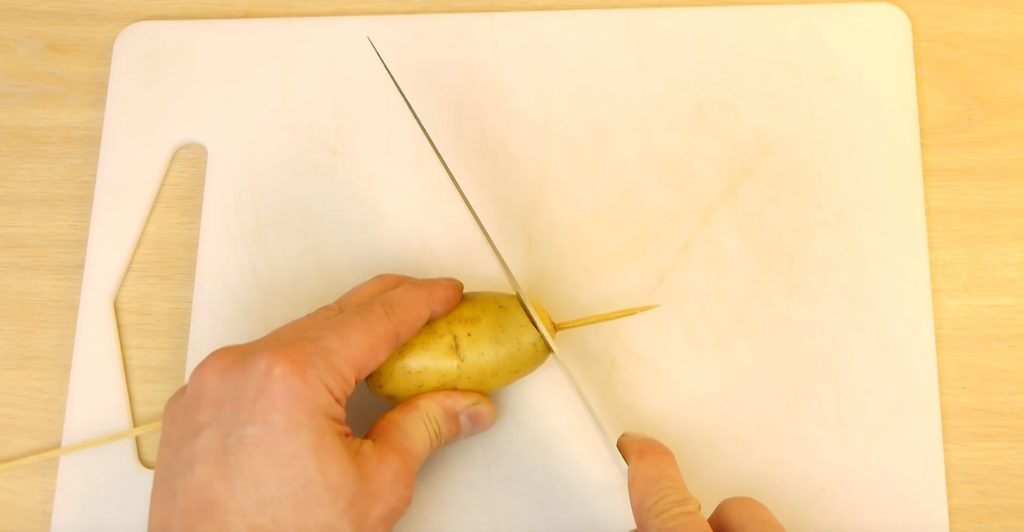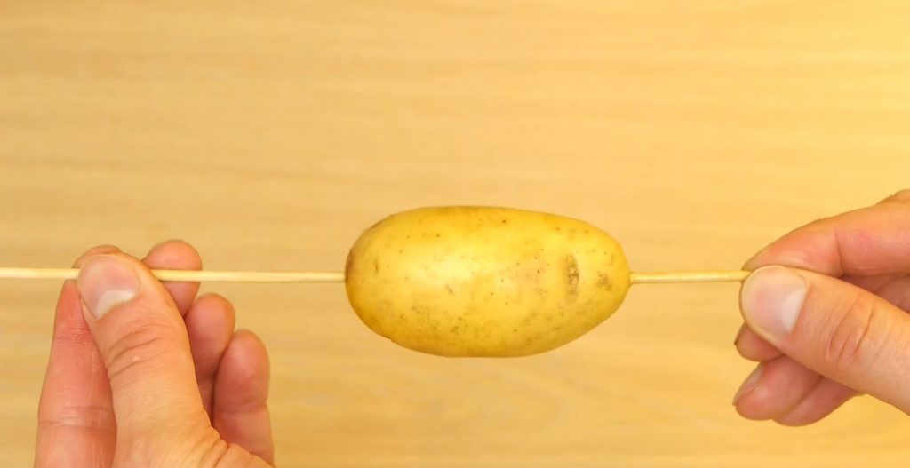 La coupe va de pair avec la rotation simultanée de la pomme de terre avec un bâton autour de l'axe, dans le rôle duquel le bâton agit. Dans ce cas, la pomme de terre est tournée de sorte qu'elle se déplace vers elle-même.