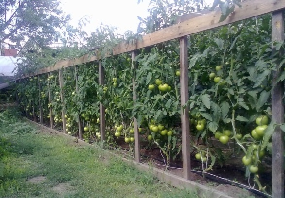 De grands piquets sont placés au début et à la fin de la tomate des lits, et entre eux ils tendent un fil ou une corde solide. En même temps, les tiges et les branches de la tomate sont attachées à ce fil.