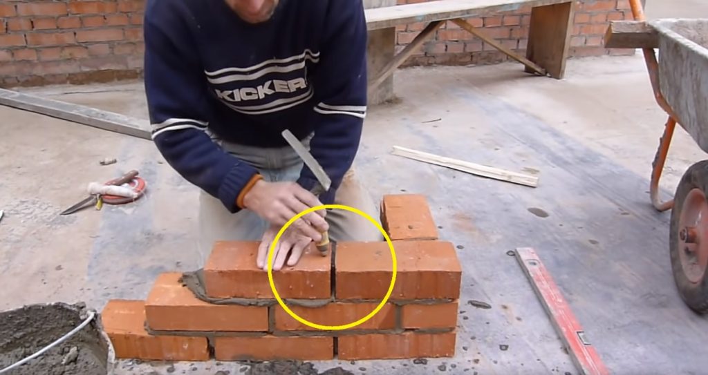 Lorsque toutes les briques de la deuxième rangée sont posées, les joints verticaux près de la brique d'angle sont enfoncés avec du mortier.