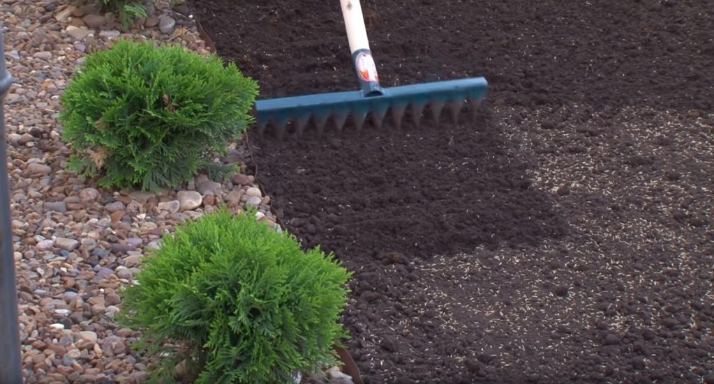 Ensuite, à l'aide d'un râteau, saupoudrez les graines de terre afin qu'elles ne se dessèchent pas. Dans ce cas, les mouvements du râteau doivent d'abord être circulaires, puis rectilignes. La profondeur ne doit pas dépasser 5 mm, car les graines d'herbe germent à la lumière.