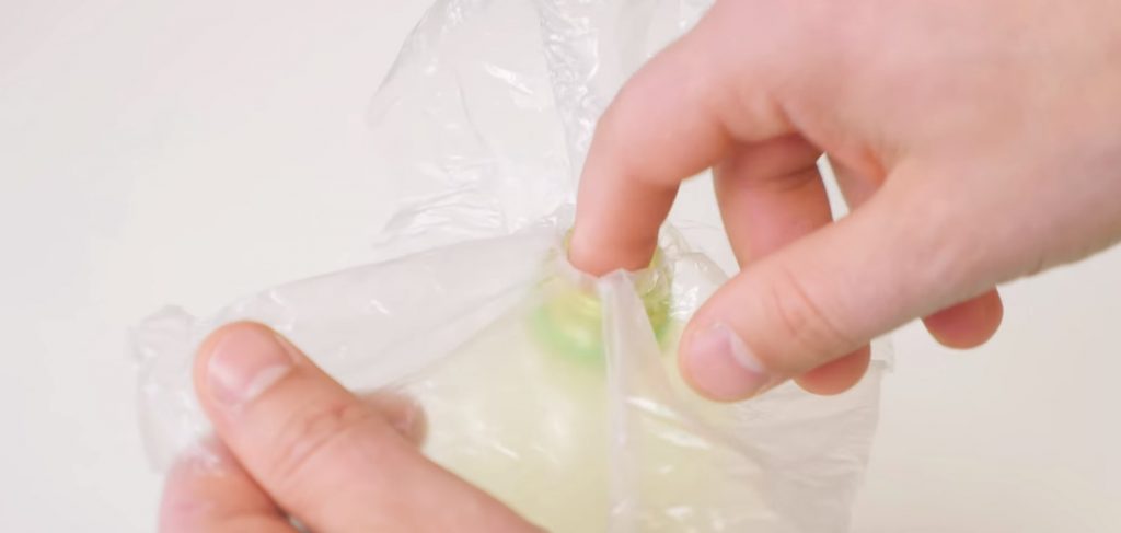 Un sac est placé sur le goulot d'une petite bouteille et une petite empreinte y est faite avec un doigt.