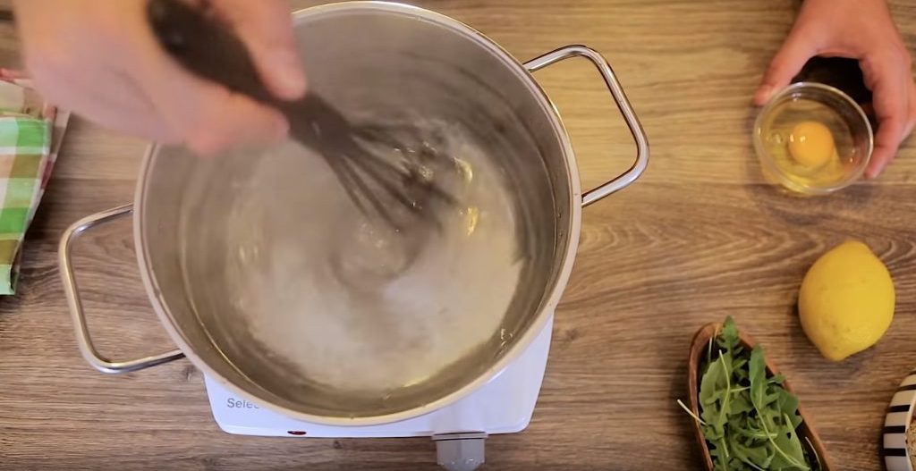 À l'aide d'un fouet, un entonnoir est formé dans la casserole. Son diamètre intérieur doit être de plusieurs centimètres.