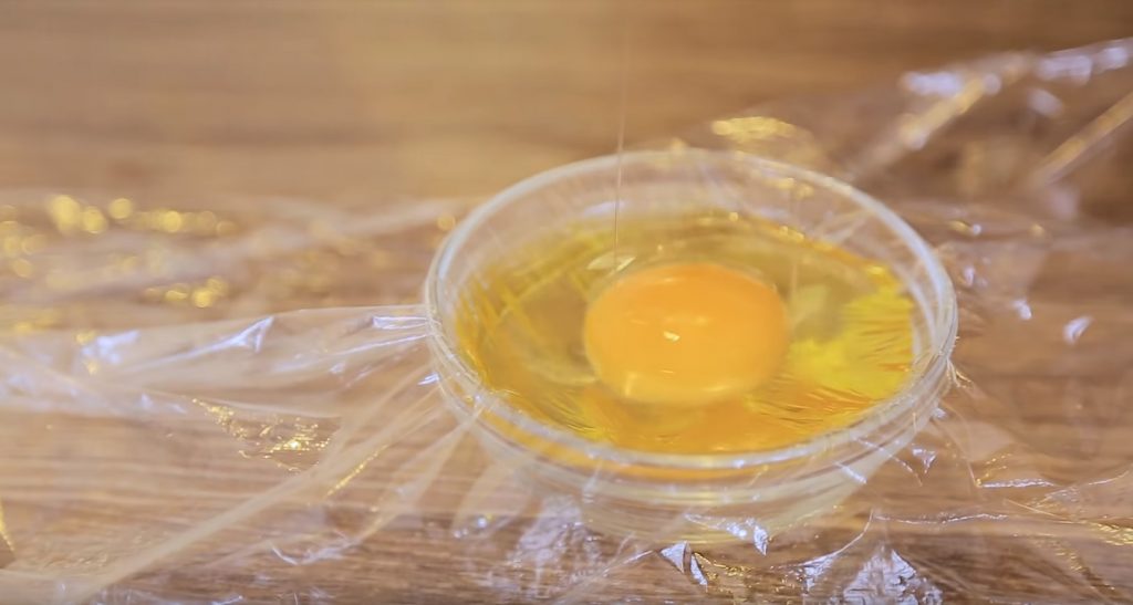 L'œuf doit être soigneusement cassé et versé dans un bol sur le film. À ce stade, vous pouvez ajouter des épices, du sel et des herbes aromatiques à l'œuf pour le goût.