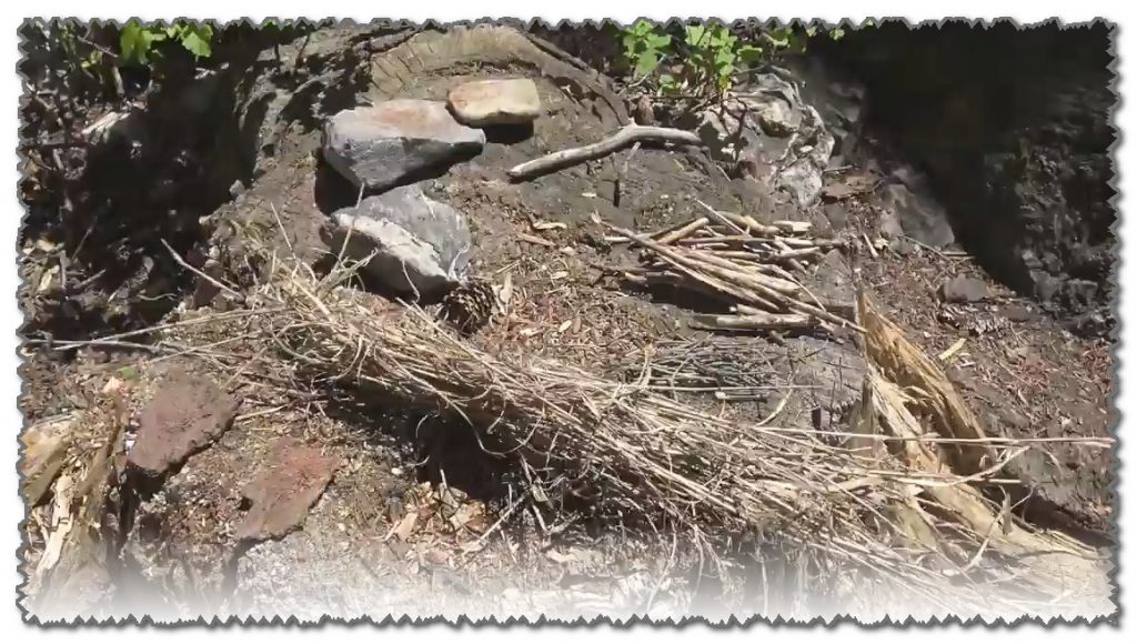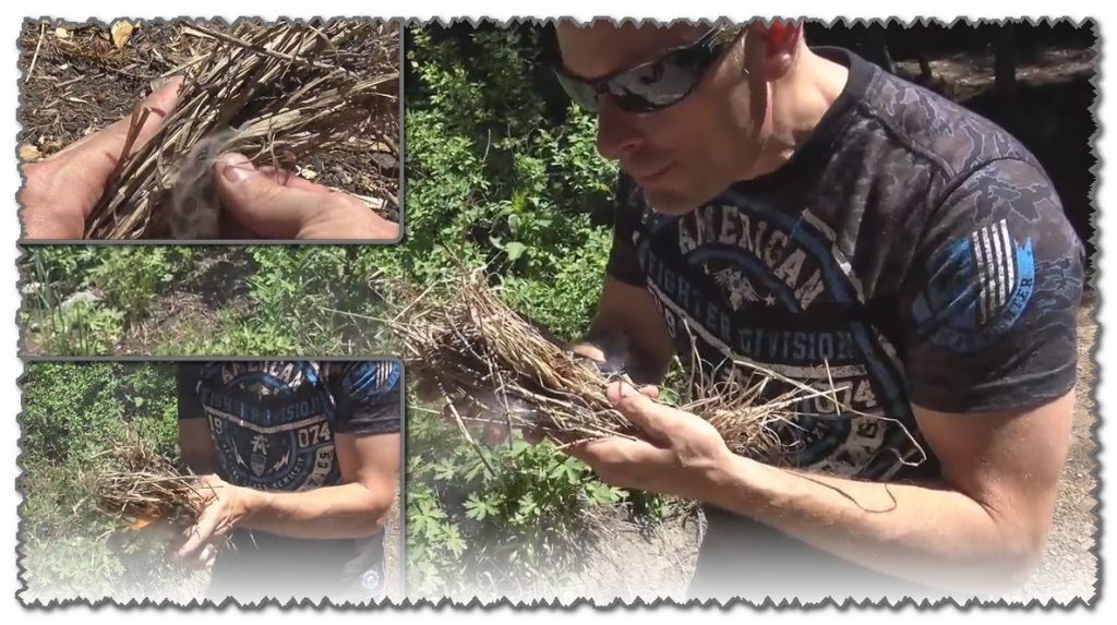 La touffe d'herbe est courbée de telle sorte que l'amadou brûlé se trouve à l'intérieur - ce dernier continue de couver cette fois - cela se voit à la fumée.