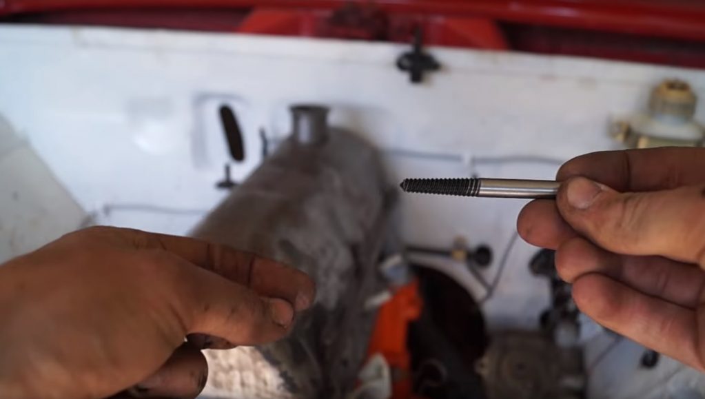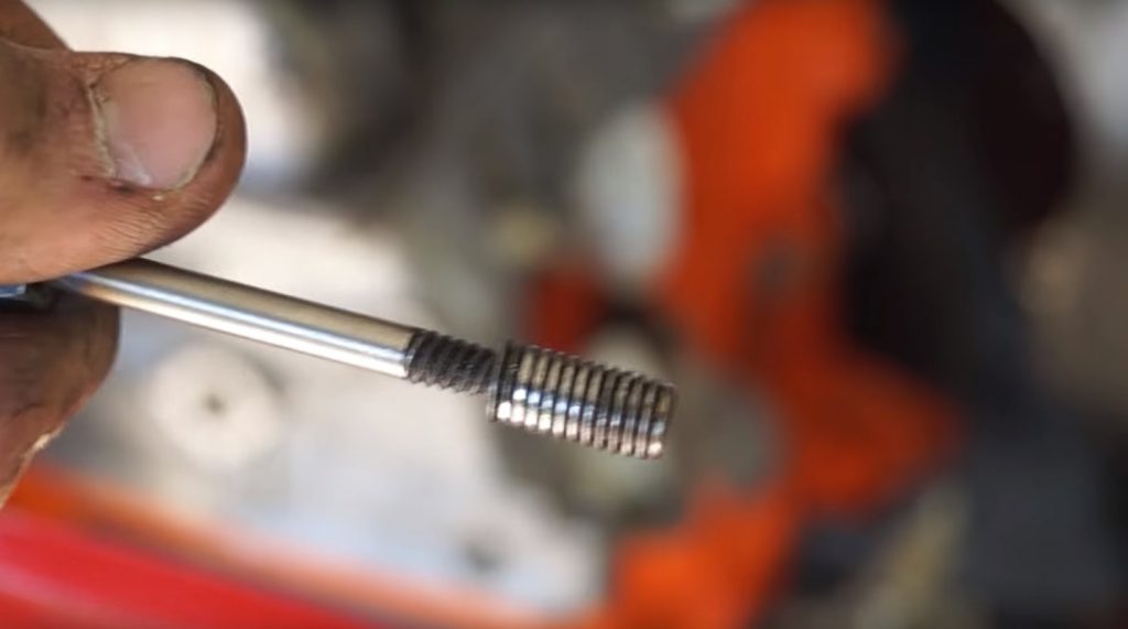 Ensuite, tout est simple - un extracteur du diamètre approprié est tordu dans le trou résultant.Cela devrait également être fait avec soin, aussi lentement que possible. Il est nécessaire d'utiliser le bon outil pour tordre l'extracteur (un taraud ou une buse spéciale pour une perceuse carrée) afin de ne pas gâcher sa fixation du côté opposé.