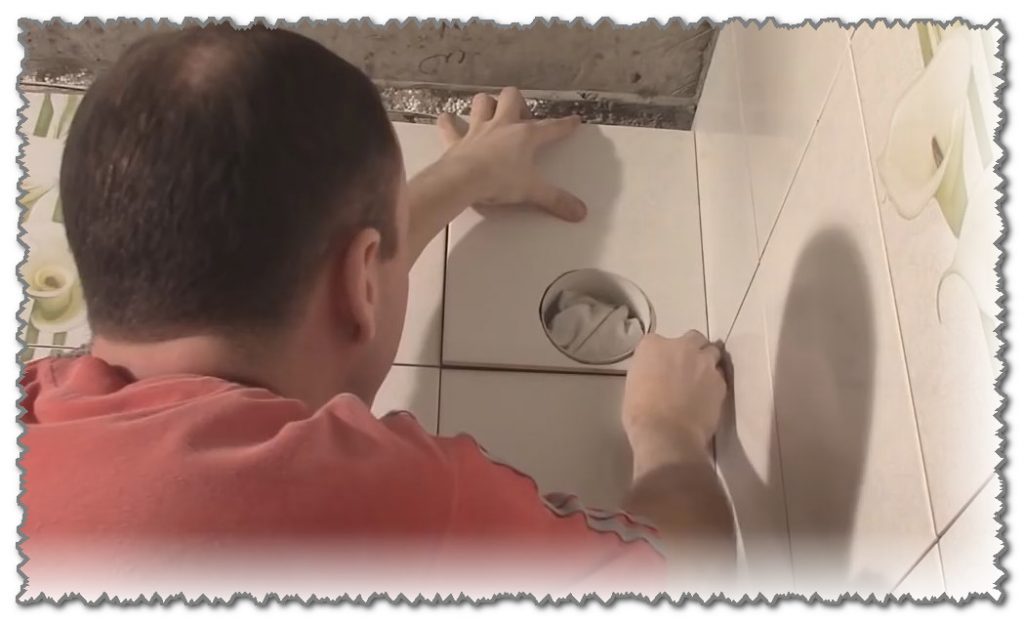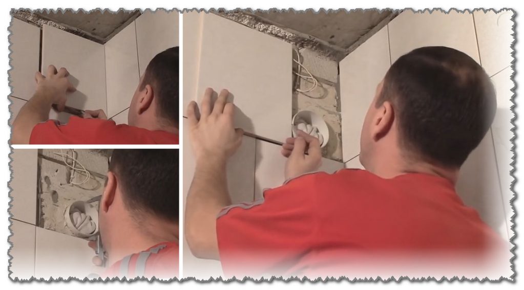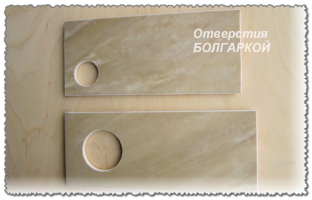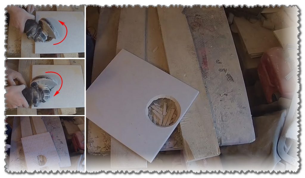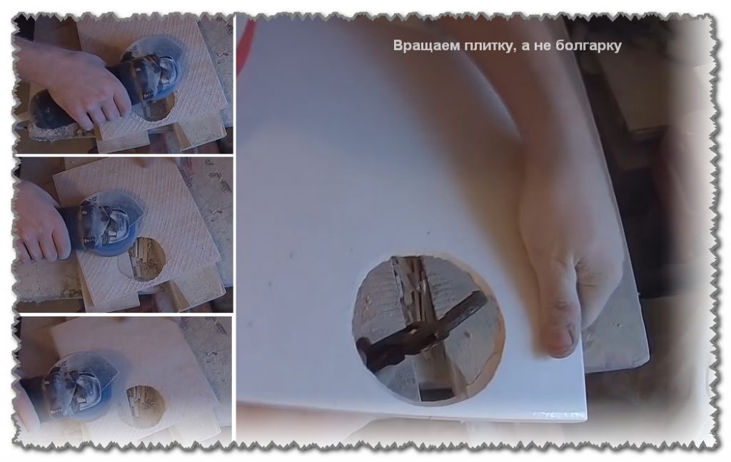 Maintenant, vous devez rendre le trou plus précis. Pour cela, nous utilisons également le broyeur. Il est plus pratique de meuler les bords en tenant la meuleuse à un angle aigu tout en faisant tourner lentement le carreau.