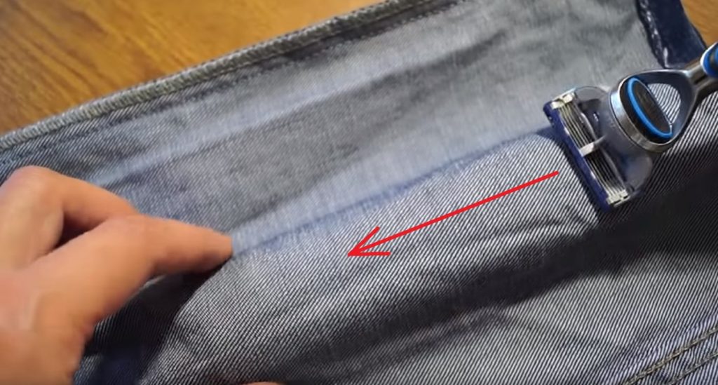 Il est recommandé d'utiliser le côté du tissu sur lequel l'épaisseur de la texture est la plus élevée. Dans ce cas, il s'agit de l'intérieur du pantalon. Dans ce cas, la barre doit être placée de manière à ce qu'il n'y ait pas de contact entre les flancs de la cassette et le dispositif d'affûtage.