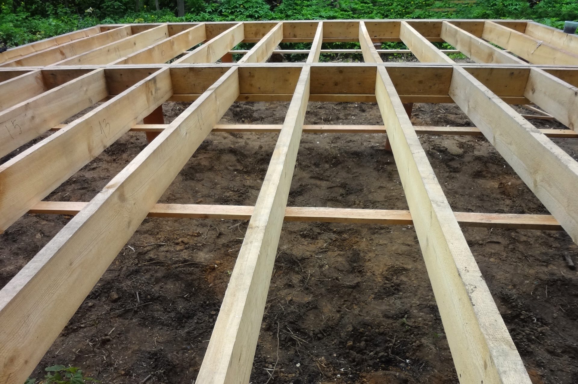 Après avoir terminé le travail avec les lits autour du périmètre, ils commencent à installer les bûches transversales. Ils sont également fabriqués à partir d'une barre de 150 sur 150 mm et sont situés à une distance maximale de 40 cm l'un de l'autre. Ils sont cloués aux lits avec des clous de la longueur appropriée, et pour une résistance structurelle supplémentaire, des cavaliers ou des coins métalliques sont utilisés.