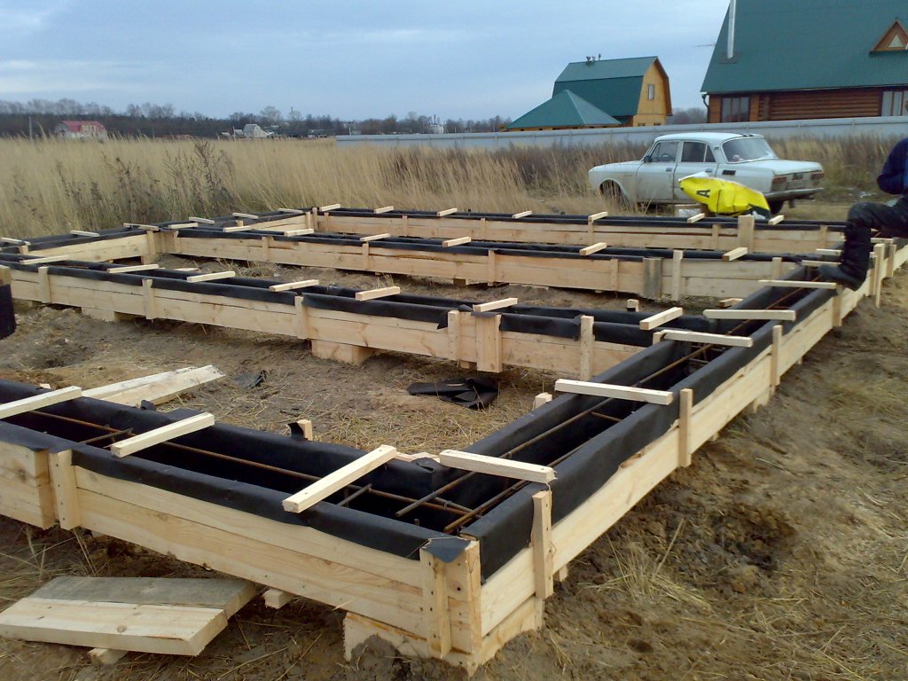 Des géotextiles sont posés au fond des douves et un oreiller est coulé sur le dessus. Son épaisseur pour les sols argileux est de 50 cm, pour les sols sablonneux - 25 cm.Ensuite, le coffrage est érigé, après quoi le cadre est constitué d'armatures et de fil d'acier.