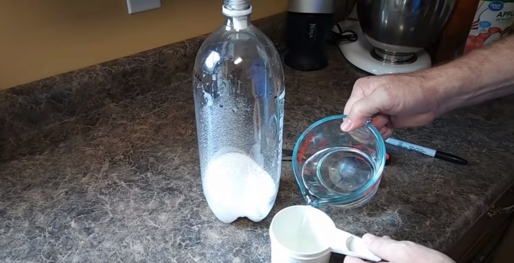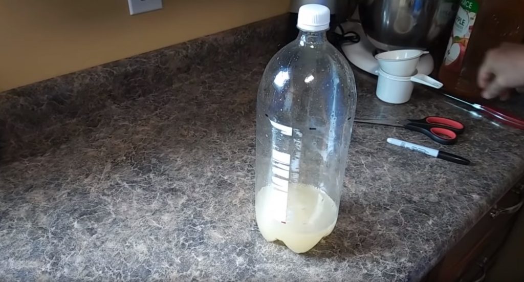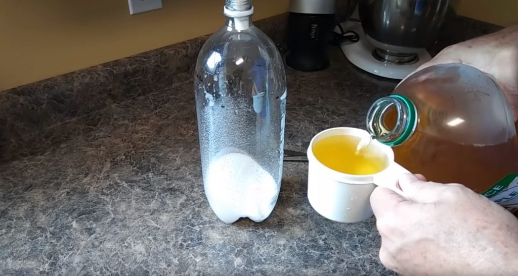 Ensuite, le mélange d'eau et de jus est versé dans la bouteille.