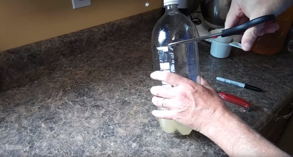 À l'aide d'un marqueur sur une bouteille en plastique, une ligne de coupe est tracée. Il est recommandé de couper le haut de la bouteille, en capturant 1 à 1,5 cm de son corps principal, là où le plastique n'a pas encore commencé à se rétrécir vers le goulot.