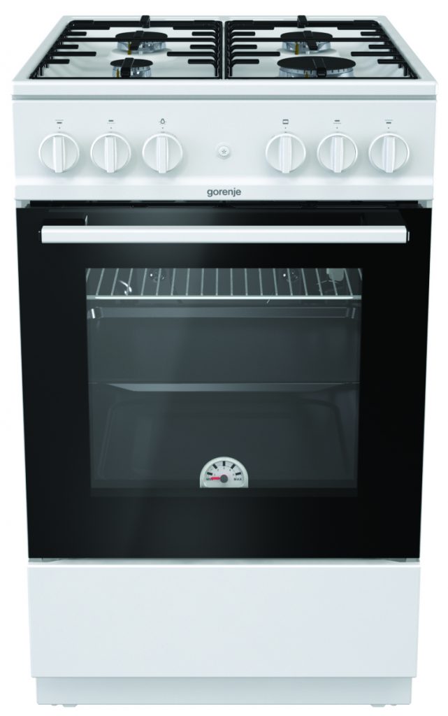 Le modèle à commande mécanique des interrupteurs rotatifs est équipé de 4 brûleurs dont 1 conçu pour une chauffe rapide. La surface de travail est en émail. Le volume du four à gaz intégré avec un système de contrôle du gaz préinstallé et une porte battante est de 50 litres.