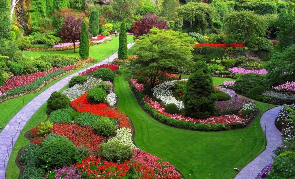 Un magnifique jardin fleuri digne d'un palais royal. Selon ce principe, de petites zones peuvent également être conçues, le long du périmètre desquelles des chemins sinueux pour la marche peuvent être aménagés. frisé parterres de fleurs comment les zones de floraison sont séparées par une pelouse parfaite. Un tel paradis sur terre.