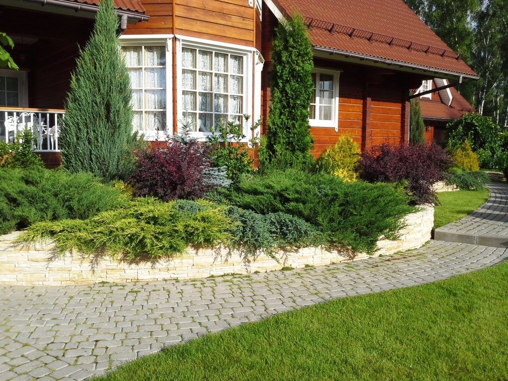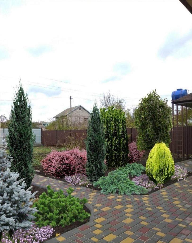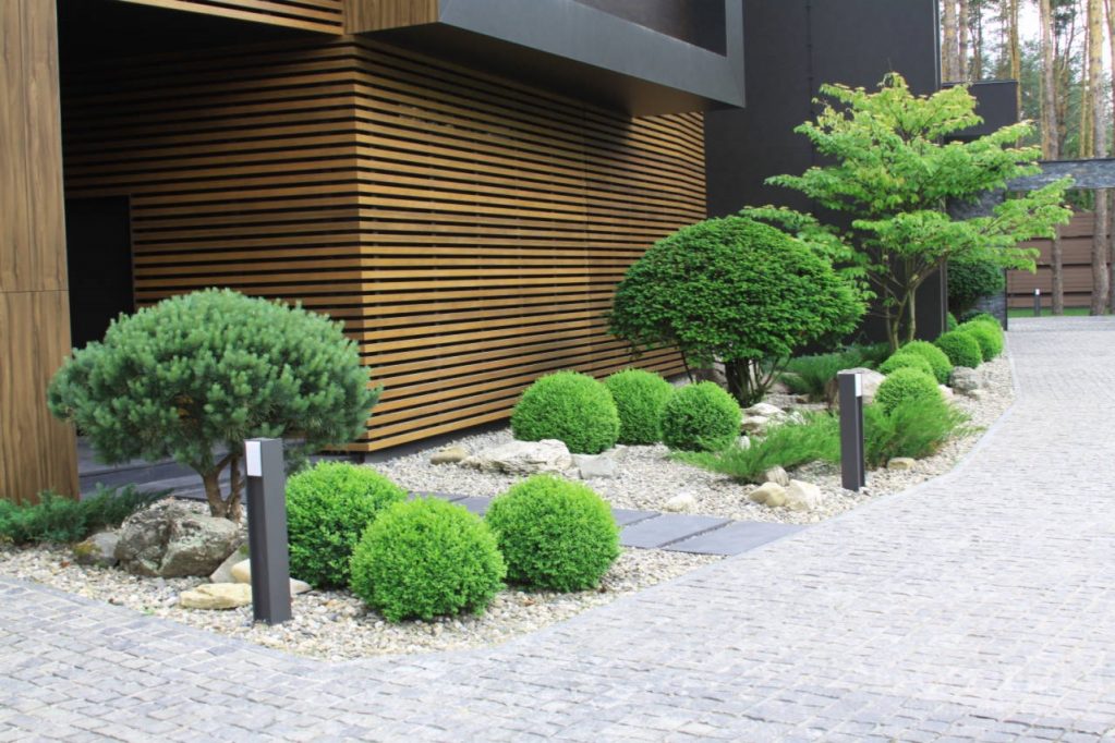 Dans le jardin à feuilles persistantes dans le style du minimalisme, les plantations de conifères sont les solistes. Leur variété est si grande que vous pouvez ramasser de minuscules genévriers, et des épicéas et des arbustes en forme de cône duveteux résistant aux changements brusques de température.