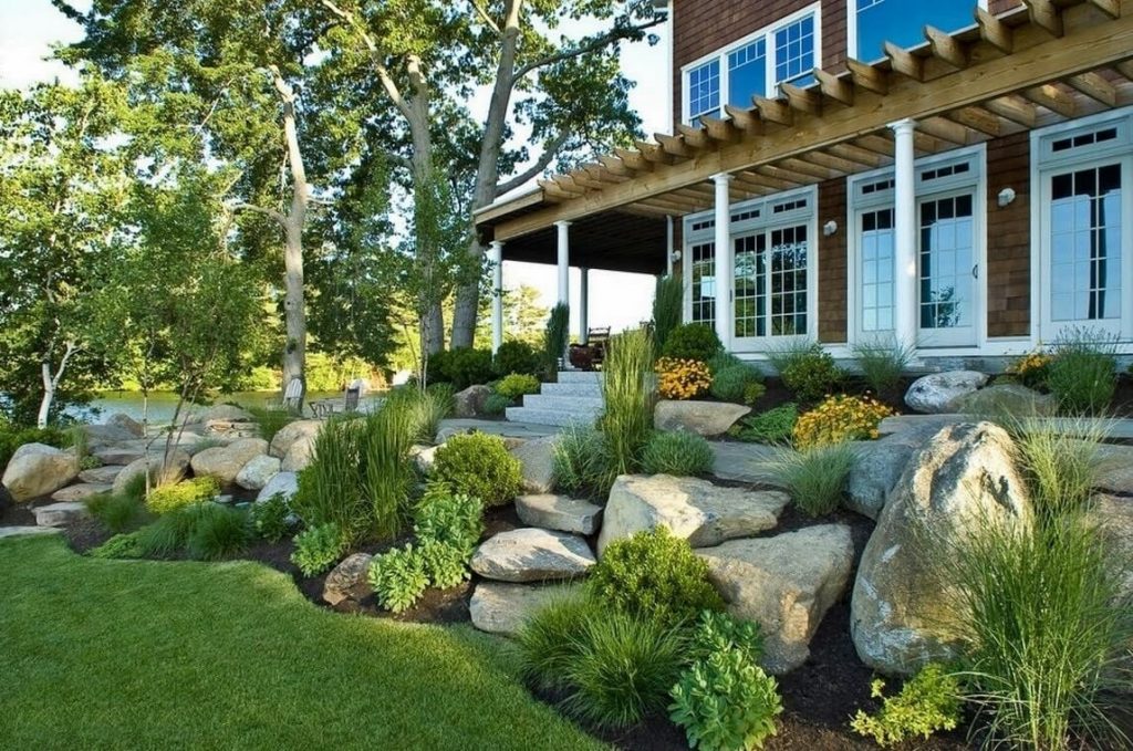 Colline alpine, rocaille - un classique et un point culminant du paysage d'arrière-cour. Mais il peut être présenté dans une variété de formes et de proportions. Ici, cela ressemble à une montagne de pierre, généreusement décorée de vivaces sous-dimensionnées, de mousses, de plantes succulentes.S'il y a beaucoup de meth dans le jardin, c'est un merveilleux élément décoratif, de plus, un toboggan de haute montagne protège le site du vent.