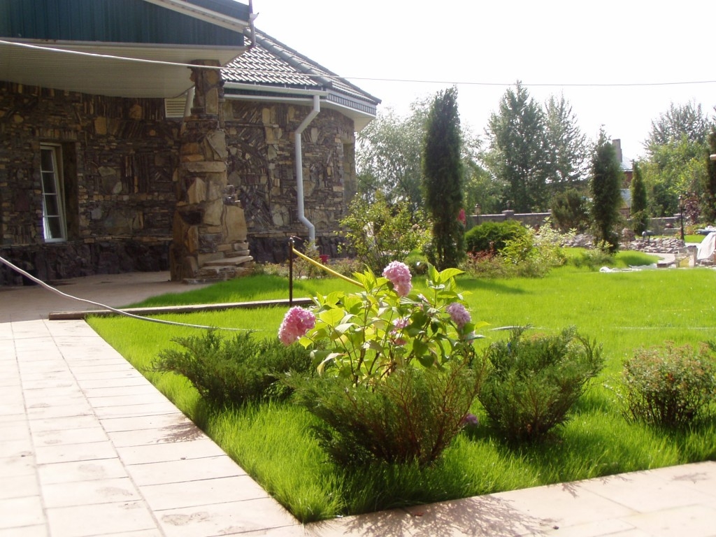 Jardin fleuri sans sentiers traditionnels. Peu de gens décident de cela, mais ça a l'air génial. Une pelouse de verdure luxuriante encadre des parterres de fleurs en fleurs et rien ne vous empêche de courir pieds nus dessus.Cette idée ne concerne que la cour arrière de la maison, car l'entrée principale est toujours très fréquentée.