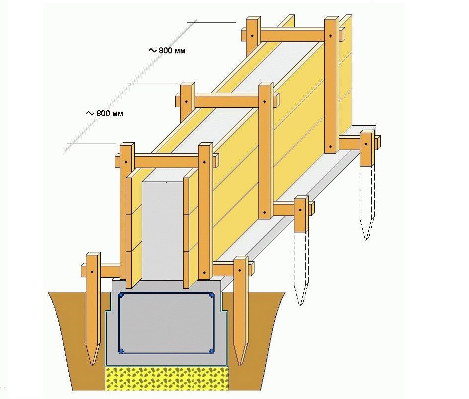 Pose de coffrage. La première étape consiste à marteler les piquets des barres aux coins de la fondation. Des barres intermédiaires sont martelées entre ces piquets avec un intervalle de 60 à 80 cm. Une planche de guidage est posée le long des barres, sur laquelle les boucliers préparés sont installés. Les avions sont fixés aux piquets installés avec des vis autotaraudeuses.