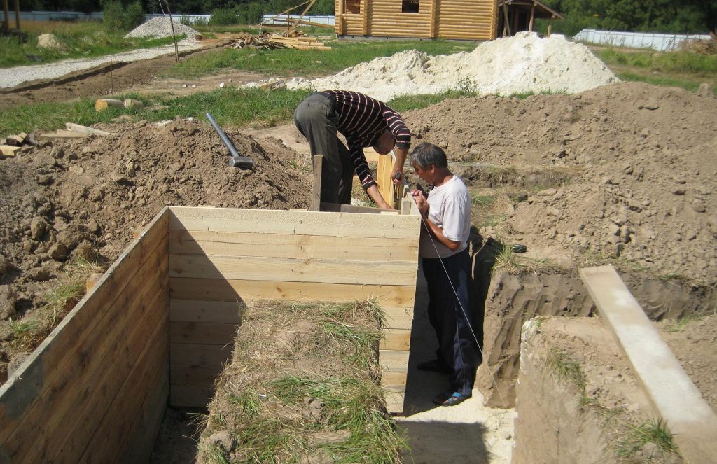 fosse de fondation. Avant de commencer les travaux, il est nécessaire de préparer une fosse de fondation pour la future fondation. Vous devez creuser des tranchées de 5 à 10 cm plus larges, de sorte qu'après avoir installé et détaché les avions des planches, vous puissiez remplir l'espace avec de la terre, renforçant ainsi la structure.