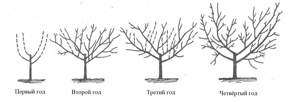 L'année suivante, après la plantation sur la tige centrale, toutes les pousses latérales sont coupées jusqu'à 50 cm. Au-dessus du tronc (de 1 à 1,2 m de haut), il reste 3 à 6 branches squelettiques, le reste, ainsi que le tronc principal, sont supprimés.