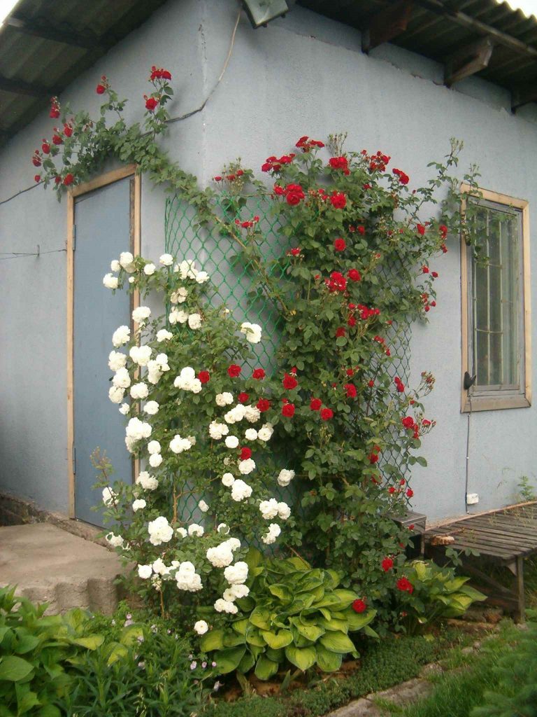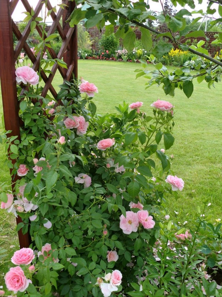 Les rosiers grimpants ont besoin de soutien. Treillis, arcs, pergolas sont utilisés en tant que tels. Les pousses sont fermement attachées à un support avec de la ficelle à plusieurs endroits.
