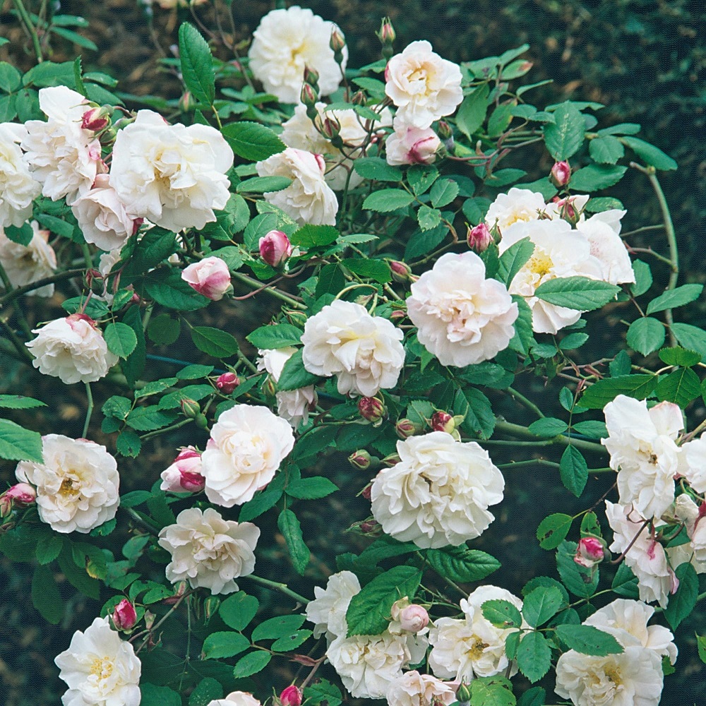Cette variété fait partie des rares rosiers polyanthus blancs. Leurs fleurs sont éponge, parfumées. Ils mesurent 5 à 6 cm de diamètre et les bords des pétales ont une teinte rose clair légèrement perceptible. Il disparaît à mesure qu'il fleurit.