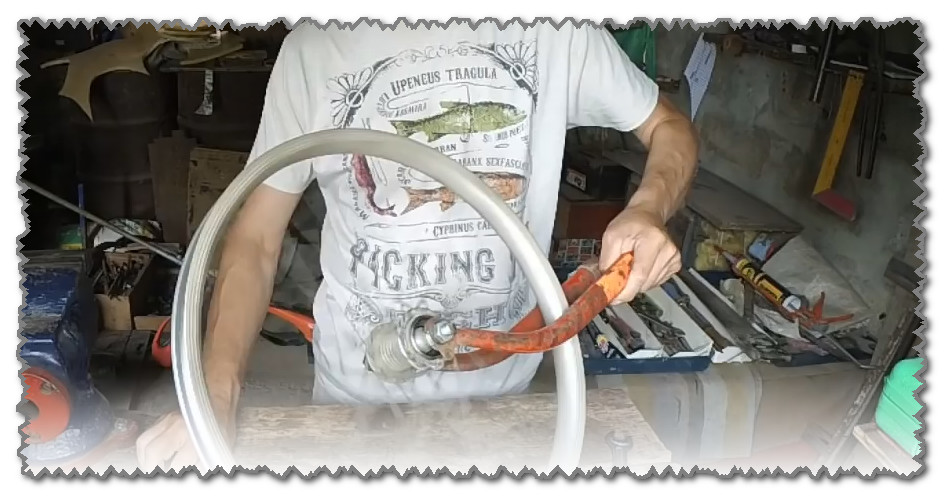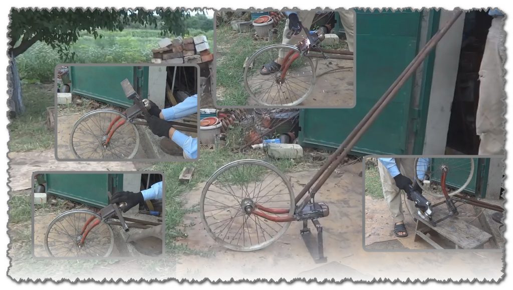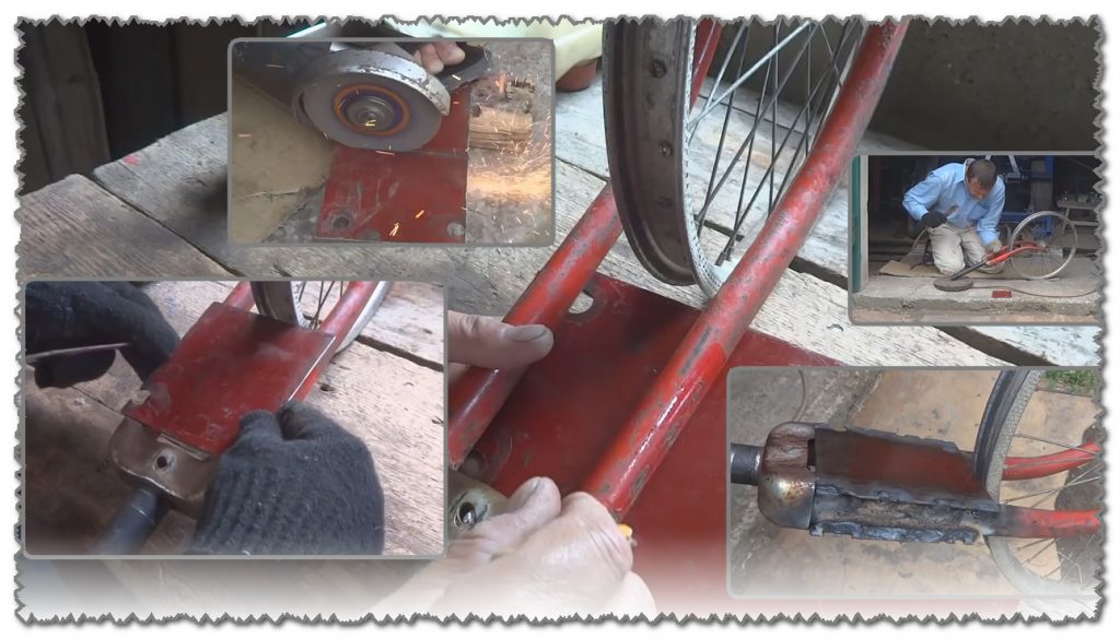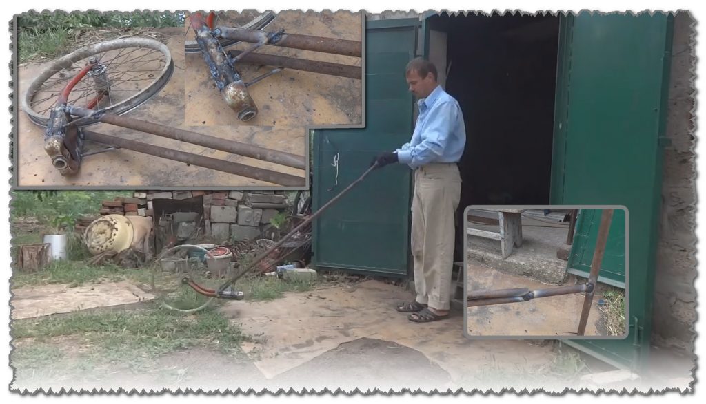Deux tuyaux doivent être soudés à la fourche, qui pilotera l'unité de désherbage. La principale chose à observer est la position horizontale de la fourche par rapport au vélo.