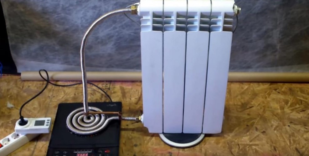 Nous plaçons le chaudron en spirale sur la plaque à induction. Et vérifiez les performances du système. Si tout est fait correctement, le radiateur chauffera jusqu'à 60 degrés en 5 minutes.