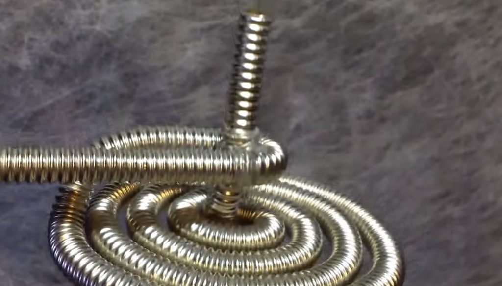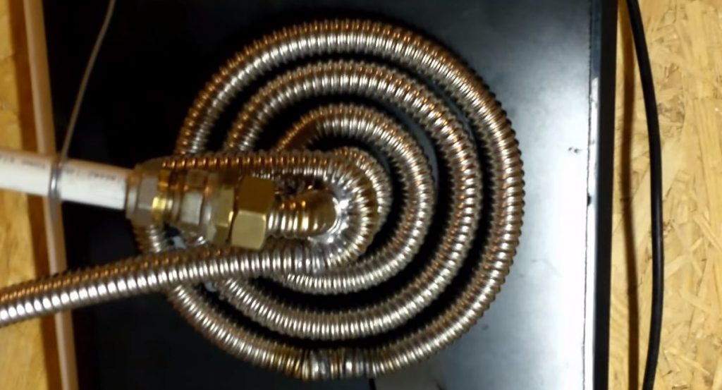 Chaudière de chauffage - un récipient dans lequel le fluide chauffant sera chauffé, c'est-à-dire l'eau. Pour le fabriquer à partir d'un tuyau en métal ondulé, nous formons une spirale, comme illustré à la Fig. 2. Cela prendra environ 1 mètre. Il est nécessaire de former une spirale de manière à ce que les extrémités restantes du tuyau soient suffisantes pour se connecter à un radiateur en aluminium.