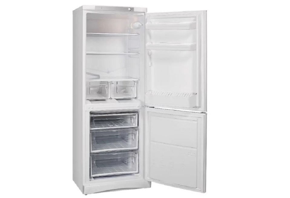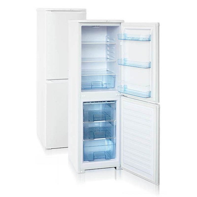 Appareil à deux chambres avec un congélateur situé en dessous. Le compartiment réfrigérateur est conçu pour 125 litres et est équipé d'un système de dégivrage goutte à goutte. Les étagères principales sont en verre. Ils sont faciles à enlever et à laver. La porte est équipée de 4 bacs dans lesquels il est pratique de ranger les sauces, les œufs. Pour les légumes, les fruits, 2 compartiments sont prévus, sous forme de boites plastiques.