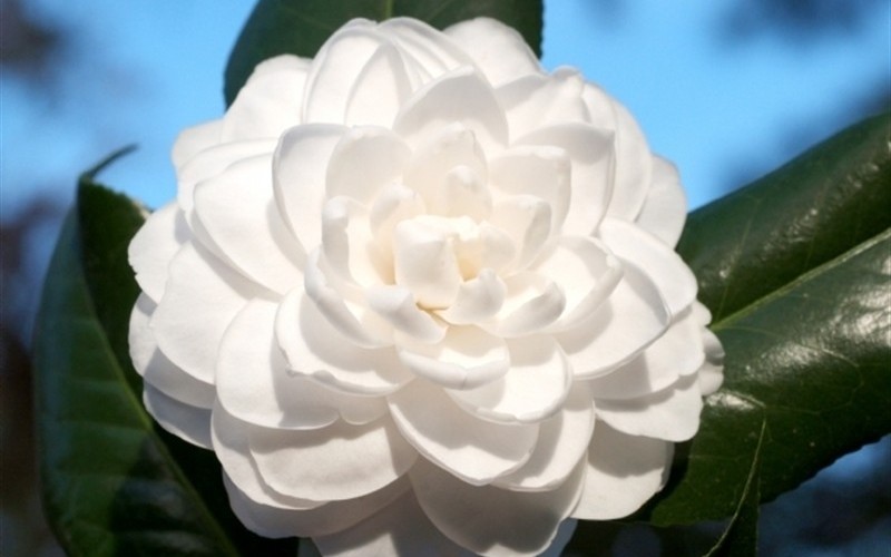 Le camélia est une plante à feuilles persistantes avec une masse dense de feuilles caduques. Traditionnellement, la teinte vert foncé des feuilles, souvent brillantes, prédomine. La taille des feuilles est principalement de 6 à 8 cm; le plus souvent, les feuilles sont caractérisées par une forme ovale, mais il existe également des feuilles allongées atteignant 11 cm de long.