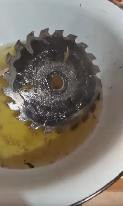 Après cinq minutes d'ébullition, l'eau deviendra trouble et sale, car toute la rouille y restera. Utilisez un couteau pour vérifier si toute la rouille a disparu en soulevant le disque au-dessus de la surface du liquide. Photo : youtube.be/Hq9yzCsFoFI