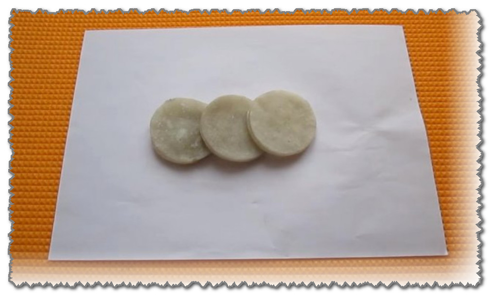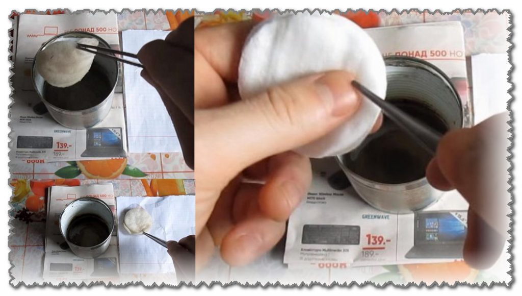 Nous nous accrochons à un disque avec une pince à épiler et le trempons plusieurs fois dans la paraffine fondue afin que le coton récupère la solution de paraffine fondue.