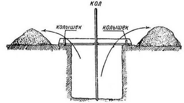 Un piquet élevé est inséré au centre de la fosse d'atterrissage, une ficelle égale au rayon de la fosse y est attachée, à l'extrémité extérieure de laquelle est attachée une cheville de 20 cm de long qui agit comme un crayon. Avec son aide, un cercle est dessiné sur le sol, ce sont les bords de la future fosse.