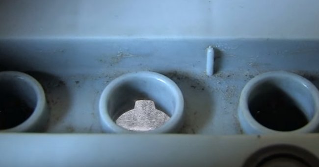À l'aide d'une lampe de poche, vous pouvez voir la sulfatation à l'intérieur de la batterie - un revêtement blanc sur les plaques. Photo : https://youtu.be/qIQfvk5j7C8