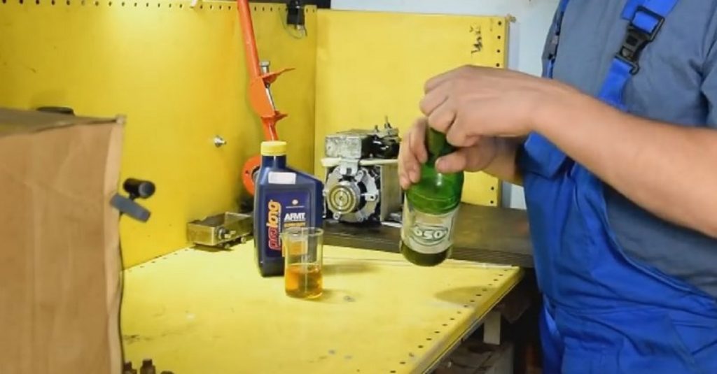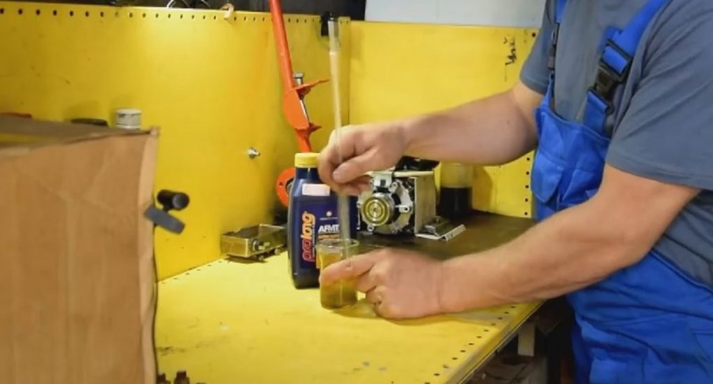 Commencez par verser de l'huile (1 partie) dans le récipient. L'utilisation de matières synthétiques est également acceptable.